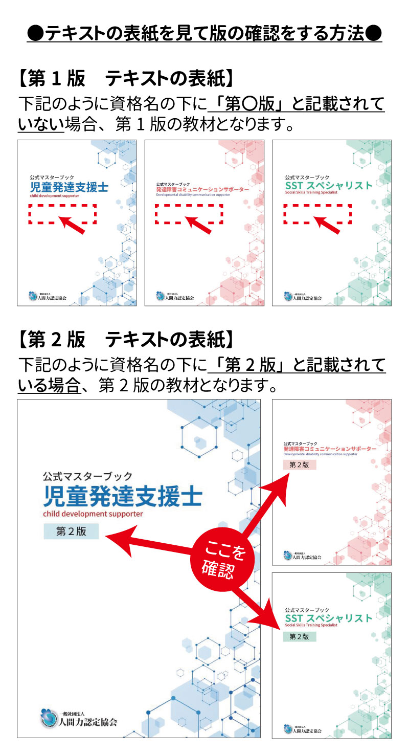 本ページからは【児童発達支援士(第1版)】【発達障害コミュニケーションサポーター(第1版)】【SSTスペシャリスト(第1版)】の試験申込が可能です。自身が受験を希望する科目に該当するか確認をお願いします。