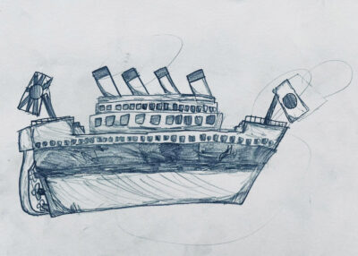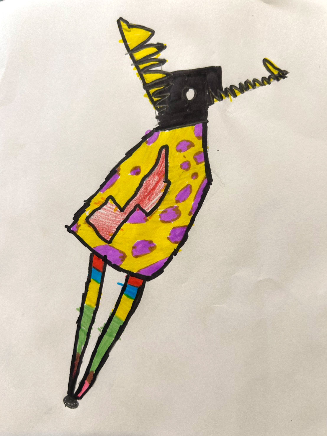 【ロボット恐竜】 クレヨンしんちゃんの恐竜日記を観たあと、「自分も好きな恐竜を描きたい!」と夢中で描きはじめました。 本人はむらさきの水玉模様と、カラフルな足のデザインをとても気に入っていて、 「ここの色、すごいかっこいいでしょ?」と何度も見せてくれました。 ロボット恐竜と呼んでいますが、ロボットではないそうです(笑) 自由な発想で表現した“だいすき!”がいっぱい詰まった1枚です。