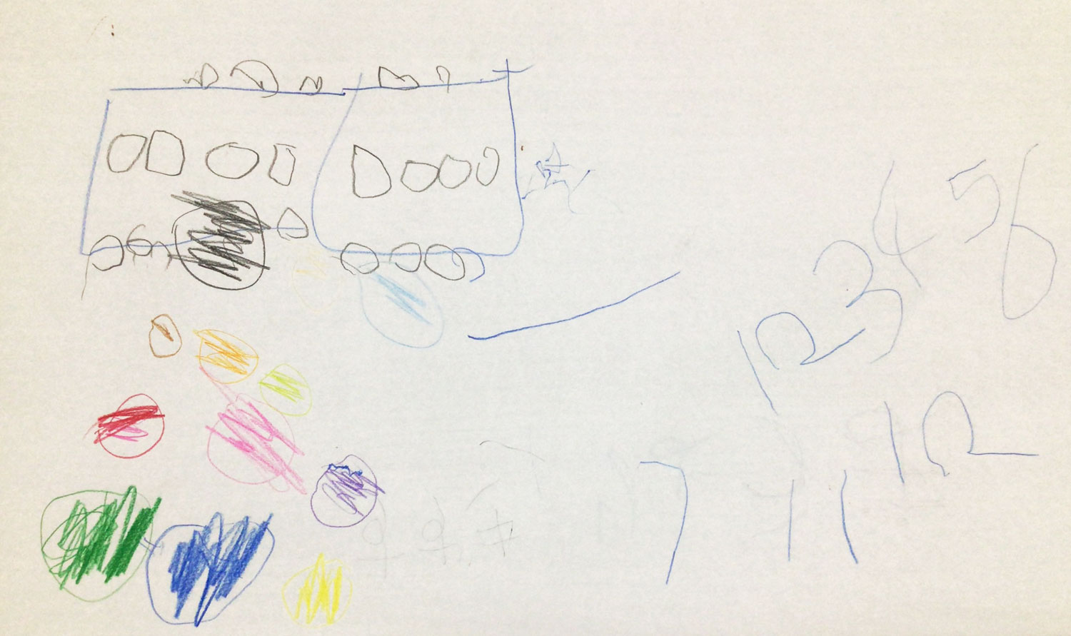 「おだんご、電車、数字と好きなもの」を描くことができました。 描いている間、支援員に楽しそうに説明してくれました。