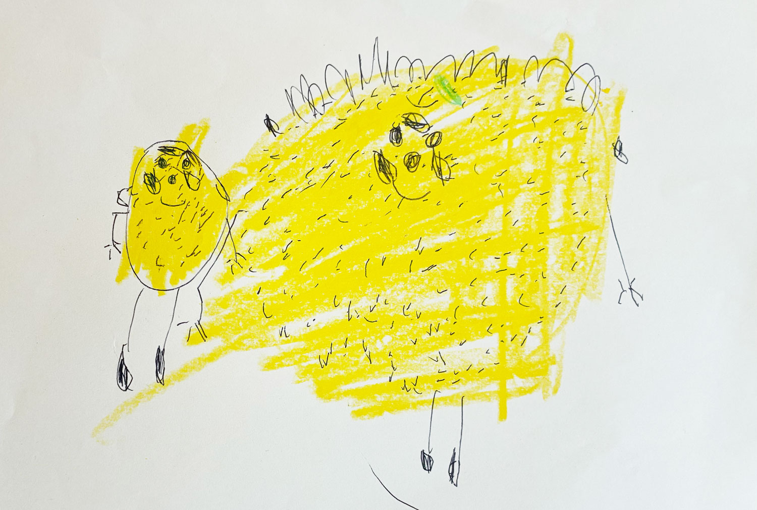 大好きな先生が梨に見えるようで…、いつもは先生だけの絵を描いていますが、この作品は梨の先生と手をつないだ自分(?)も描かれていています。