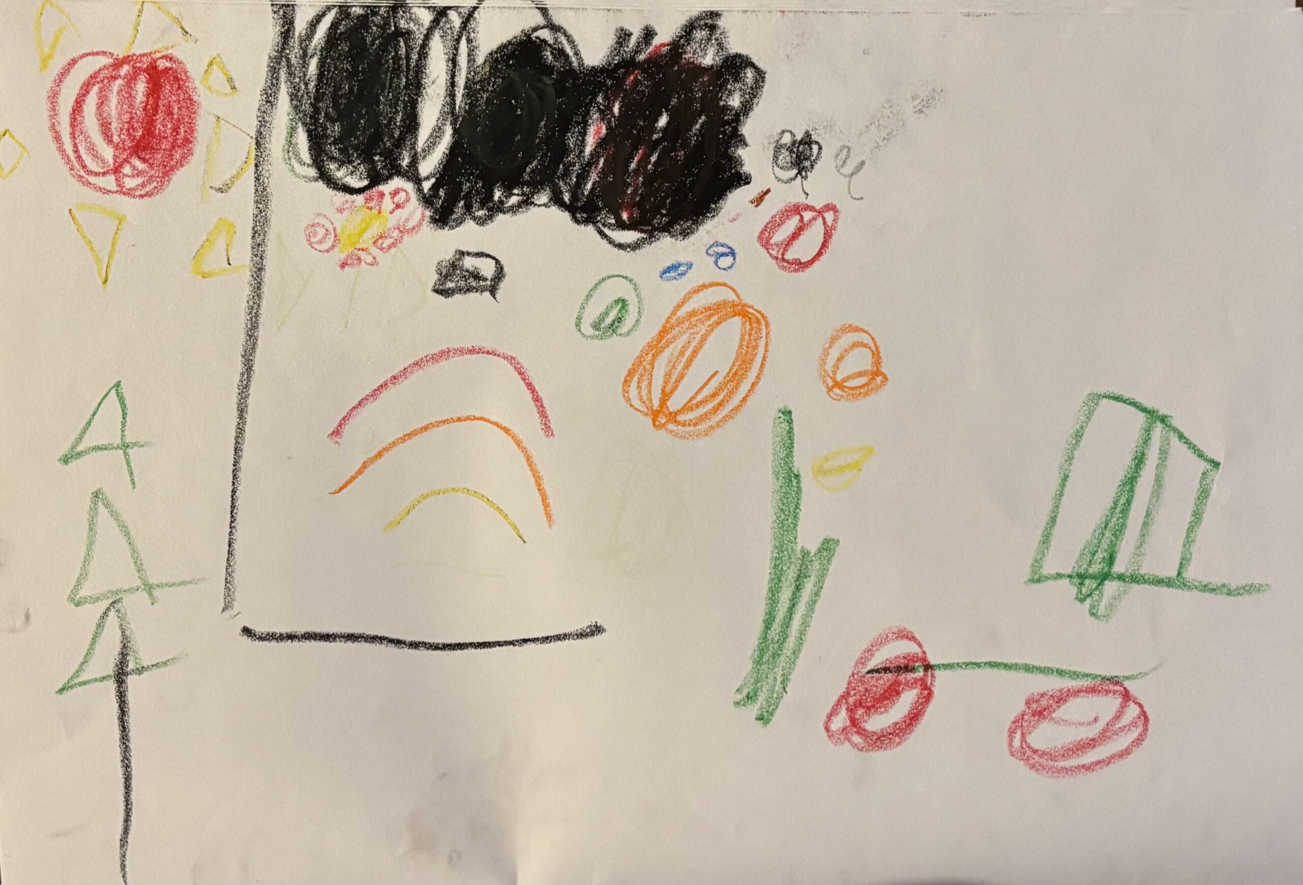太陽や虹、好きなトラックも描きました。色をたくさん使って描く