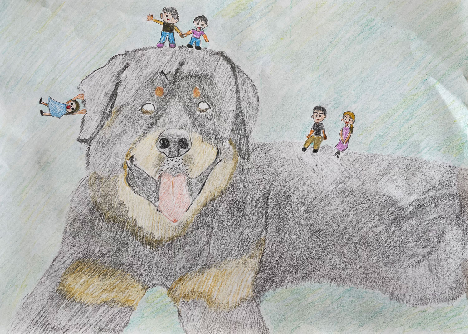 あえて今回、家族メインで描くよりも、今は亡き昔飼っていた犬をメインとして、その周りに家族を描き、みんなで仲良く暮らしていた思い出を絵にしました。