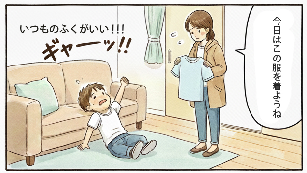 汚れて洗濯中の「いつもの服」を着たがり、別の服を提案するとパニックになる。
