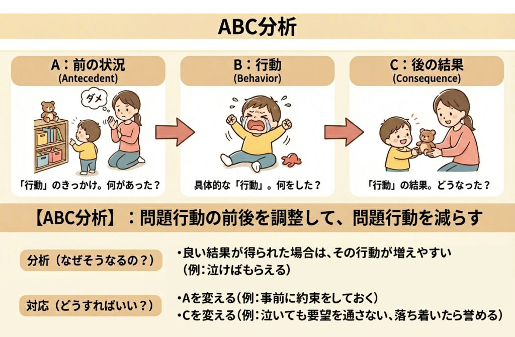問題行動の「前」と「後」を調整することで、その行動を減らす考え方です。
